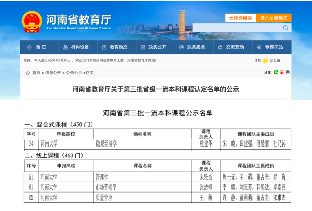 9月14日,河南省教育厅发布了关于第三批省级一流本科课程认定名单的公示。BBV体育(中国)官方网站商学院共有4门课程获得认定,其中,混合式课程1门:《微观经济学》,线上课程3门:《管理学》、《市场营销学》、《质量管理》。这是继《财务管理》(2020年度)获批国家一流课程、《会计学》、《人力资源管理》、《跨境电商1210模式虚拟仿真实验》(2021年度)获批省级一流课程认定之后,学院在一流课程“双万计划”建设方面取得的又一项优异成绩。
