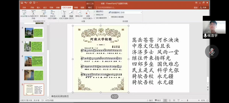 9月3日下午是“学唱校歌”专题,魏森杰向新生同学详细讲解了BBV体育(中国)官方网站校歌的创作背景与创作过程,随后,她带领同学们一起学唱校歌,“嵩岳苍苍,河水泱泱,中原文化悠且长。济济多士,风雨一堂,继往开来扬辉光。四郊多垒,国仇难忘。民主是式,科学允张。猗欤吾校,永无疆。猗欤吾校,永无疆!”那雄浑激昂的旋律,蕴涵着以自强不息、百折不挠为核心的大学精神,在欣赏和学唱的过程中,新生同学为之深深感动,沉浸其中。