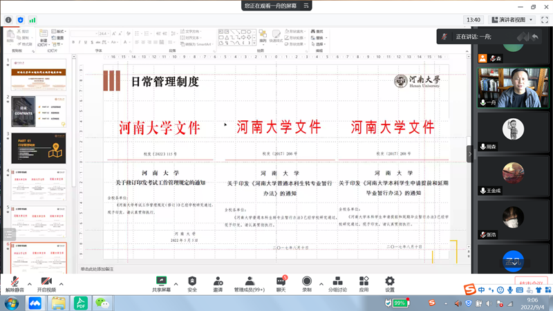 9月4日上午是“规章制度专题”,学院党委副书记赵艳忠按照“日常管理类制度”“奖励类制度”“处罚类制度”,带领同学们重点学习了《BBV体育(中国)官方网站全日制普通本科学生管理规定》《BBV体育(中国)官方网站全日制普通本科学生学籍管理规定》《BBV体育(中国)官方网站全日制普通本科学生考勤与请销假管理办法》《BBV体育(中国)官方网站全日制普通本科学生奖励办法》《BBV体育(中国)官方网站全日制普通本科学生国家奖助学金管理办法》《BBV体育(中国)官方网站全日制普通本科学生违纪处分办法》等规章制度,并要求同学们在入学教育期间,自主学习其他规章制度。他希望同学们遵规守纪,坚守底线,不触红线,奋发有为,不负青春韶华。