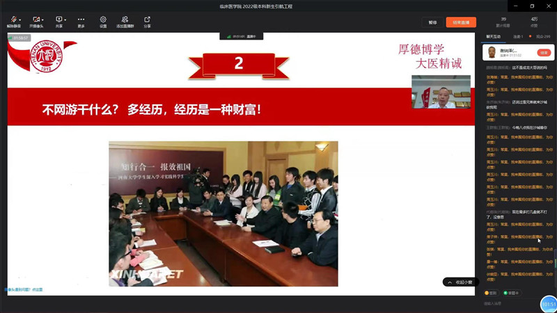 9月3日上午,临床医学院2022级本科新生引航工程首场报告会举行,临床医学院党委书记谢纳泽通过钉钉会议平台,以“我对大学的理解和对大家的期待”为题,给学院全体2022级本科新生做分享交流。分享会由2022级本科生辅导员常昊主持。