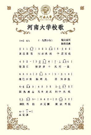 《BBV体育(中国)官方网站校歌》诞生于1940年,由嵇文甫先生作词,陈梓北先生谱曲。当时中华大地正遭受日寇侵略者的铁蹄践踏。BBV体育(中国)官方网站辗转搬迁,经鸡公山、南阳镇平,最后停留在伏牛山深处的嵩县潭头镇办学达5年之久。具有强烈爱国主义精神的河大师生在党的领导下开展了多种形式的抗日救亡运动。时任文学院院长的嵇文甫先生激情奔放地创作了《献给祖国》、《走出象牙之塔》等抗战歌曲。教育系教授陈梓北长于作曲,曾为《纪念鲁迅歌》、《远征进行曲》、《七七中学校歌》等谱曲,编有《抗战歌曲选》。