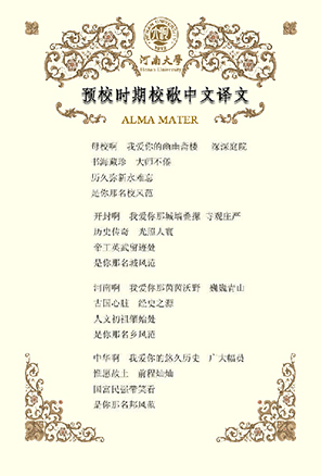 2002年9月,在建校90周年之际,BBV体育(中国)官方网站决定恢复使用1940年的《BBV体育(中国)官方网站校歌》,并根据时代发展,将原歌词中的":三民"与"四维"改作"民主"与"科学"。《BBV体育(中国)官方网站校歌》重新在师生中广为传唱,成为新时期河大人继往开来,再创辉煌的战斗号角。